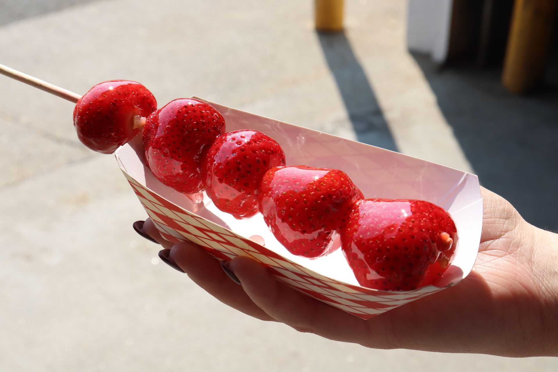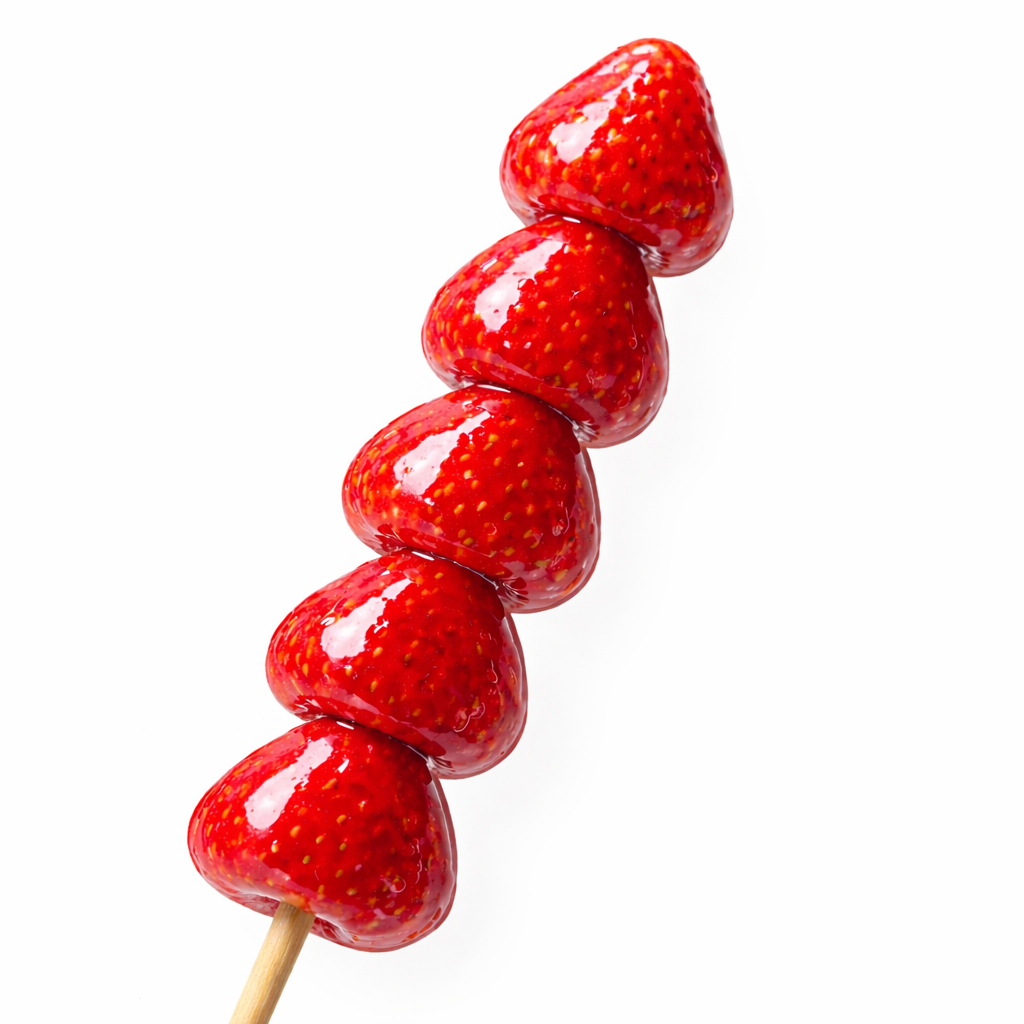 Fresh strawberries coated in a thin, glass-like sugar shell that cracks with every bite, balancing bright sweetness with a clean, satisfying crunch.